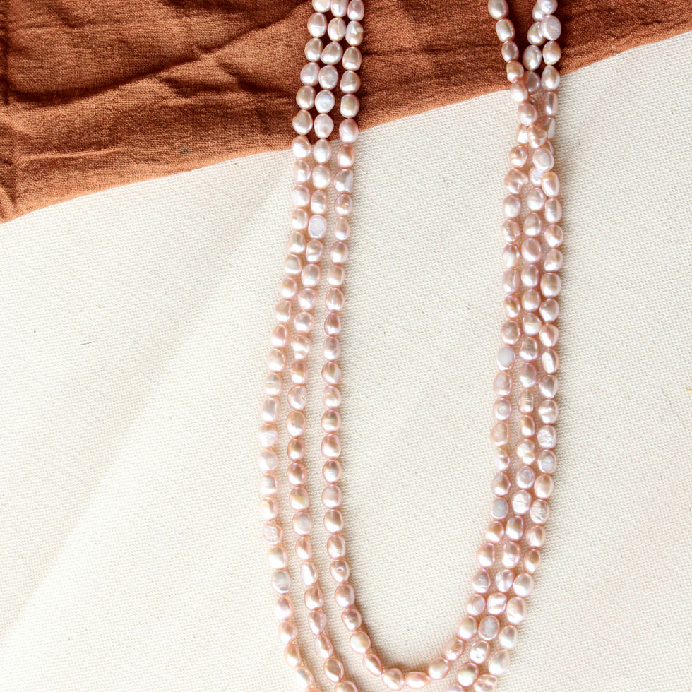 - Necklace: Multistrand design with high-quality, blush pink pearls