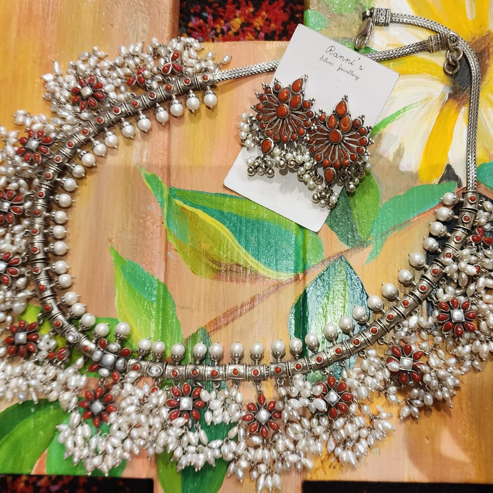 Introducing the stunning Real Coral and Pearl Necklace with Earring set, exclusively available at Ranni's Regalia silver jewellery store. Crafted with genuine coral and freshwater pearls, this set exudes elegance and sophistication. The necklace features a gorgeous combination of vibrant coral beads and lustrous pearls, while the matching earrings add the perfect finishing touch. Whether you're dressing up for a special occasion or looking to elevate your everyday style, this set will effortlessly elevate any outfit. Embrace the natural beauty of the ocean with this exquisite coral and pearl set, a must-have for any jewellery collection.