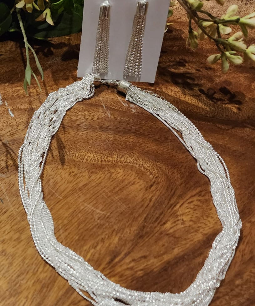 Introducing the perfect addition to any jewelry collection, the Plain Silver Chains Necklace plus Earring set from Ranni's Regallia 92.5 silver jewellery store. Made with high-quality 92.5 silver, this set is designed for those looking for a timeless and versatile piece. The necklace is a classic chain design, perfect for everyday wear or for layering with other necklaces. The matching earrings feature a simple and elegant design, making them a great choice for any occasion. This set is a must-have for anyone who appreciates the beauty and sophistication of silver jewelry. Upgrade your look with this stunning Plain Silver Chains Necklace plus Earring set today.