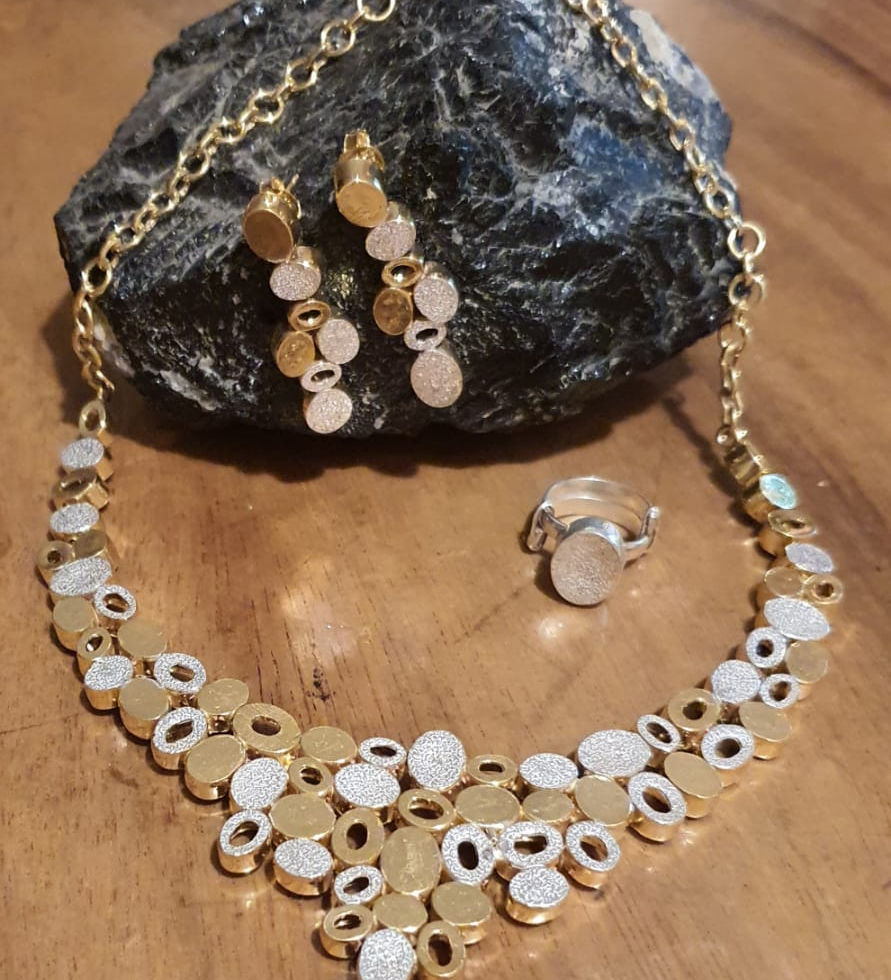 Elevate your silver jewelry collection with our stunning Two tone mat finished set from Ranni's Regallia 92.5 silver Store. This beautiful set includes a necklace and matching earrings, both crafted from high quality 92.5 silver and finished with a two-tone mat finish for a unique look. The intricate details and craftsmanship make this set a truly special addition to any outfit. Whether you're dressing up for a formal event or adding a touch of elegance to your everyday attire, this set is the perfect choice. Treat yourself or a loved one to this exquisite Two tone mat finished set from Ranni's Regallia 92.5 silver Store.